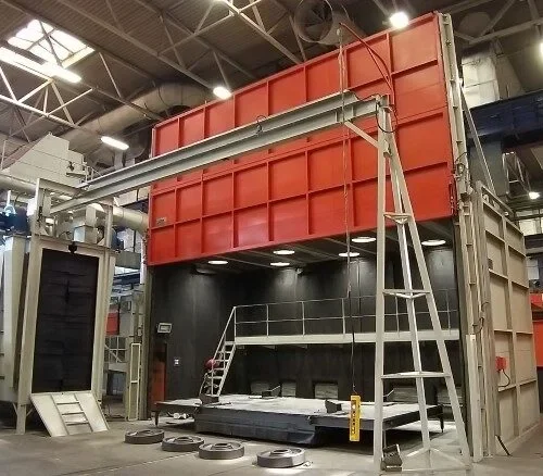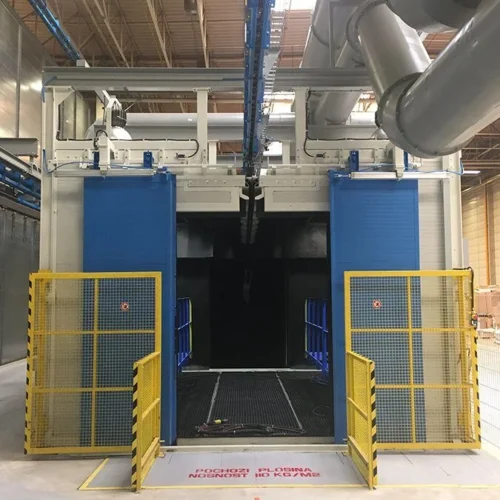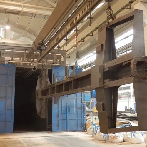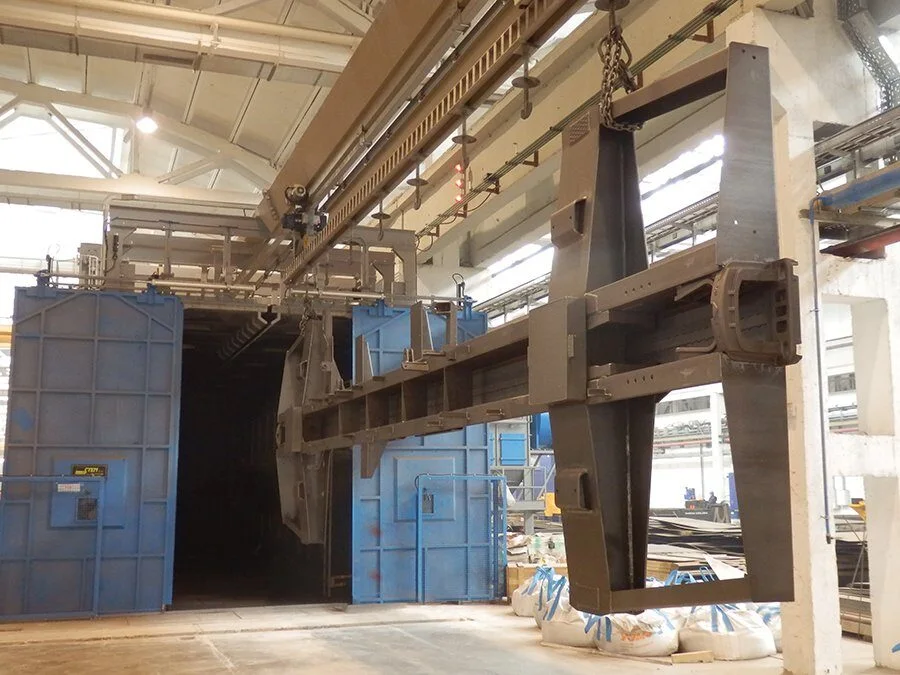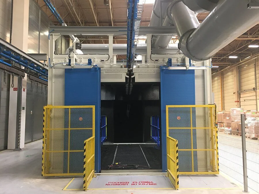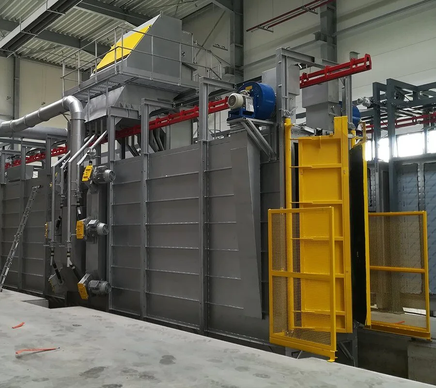 Die Typ »TOR« Strahlmaschinen sind ideal für das Strahlen von Schweißkonstruktionen, Trägern und Profilen großer Längen. Sie können eigenständig mit eigener Hängebahn betrieben oder in bestehende Fördersysteme integriert werden und sind optional mit Färbelinien und Trockenkammern kombinierbar. Während des Strahlens werden die Werkstücke an Haken durch den Tunnel transportiert, wobei seitliche Turbinen eine gleichmäßige Oberflächenbehandlung sicherstellen – ganz ohne Drehbewegung. Anschließend erfolgt die automatische Weiterförderung, während das Strahlmittel in einer separaten Kammer entfernt wird. So gewährleisten die Typ »TOR« Maschinen eine effiziente und hochwertige Oberflächenbehandlung großer Bauteile.