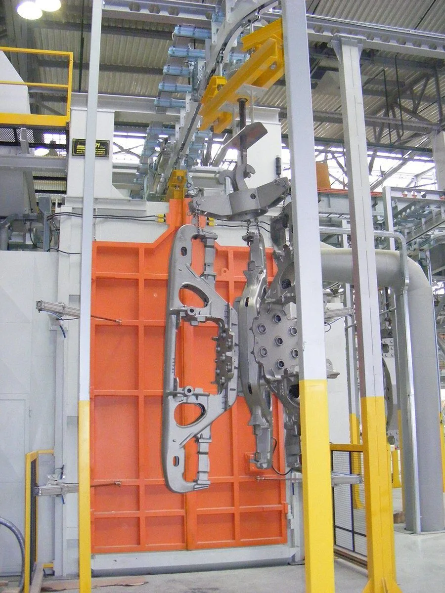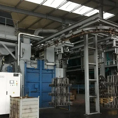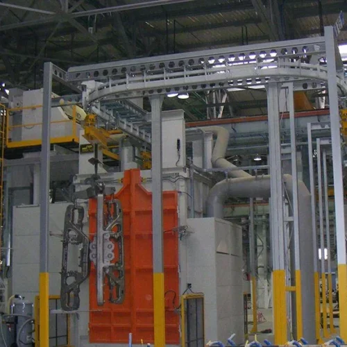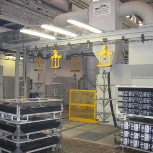 Werkstücke takten über Gehänge durch die Anlage. Diese werden entweder auf einer starren Kette, oder einzeln angetrieben durch einen Power&Free-Antrieb, durch die Anlage geführt.